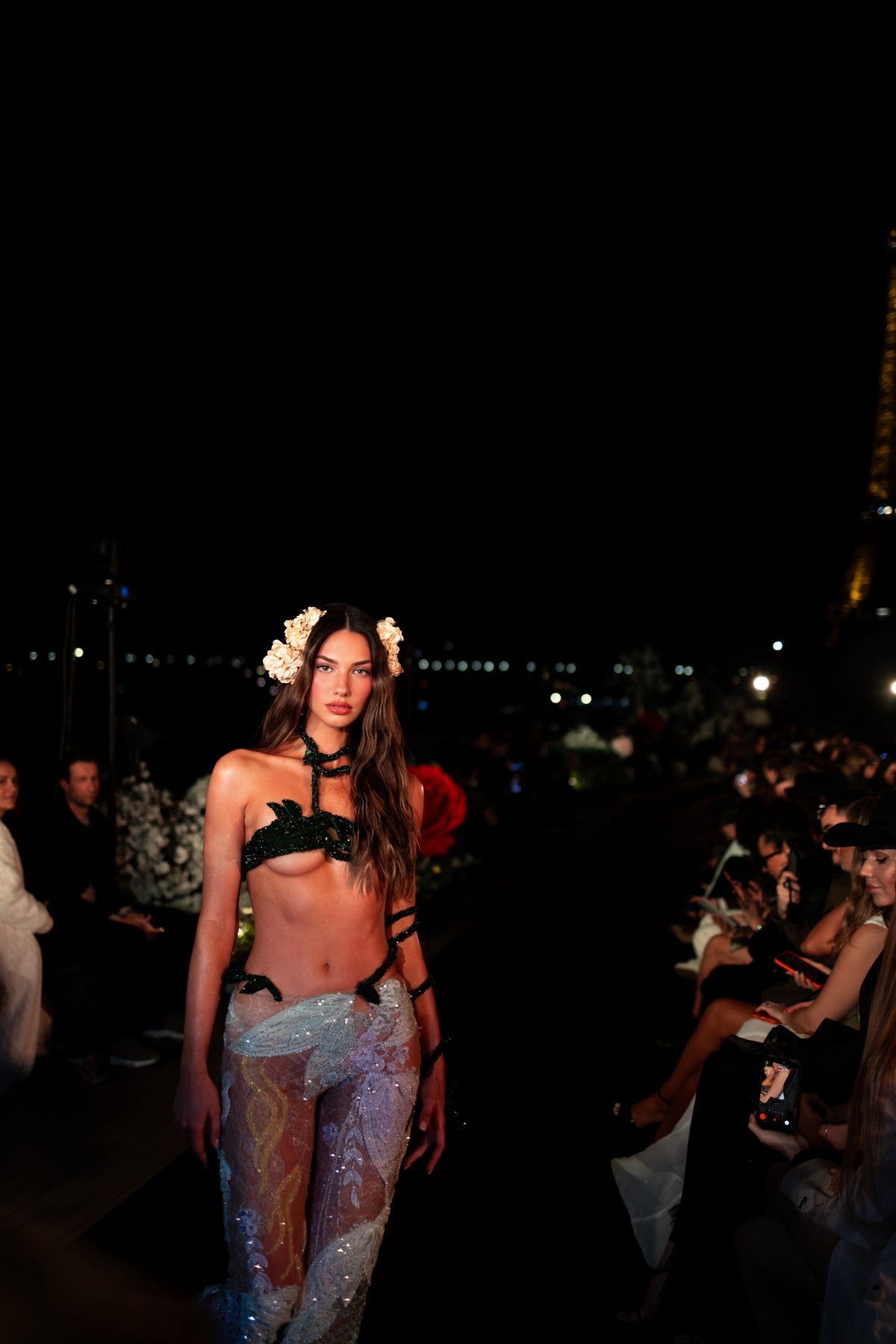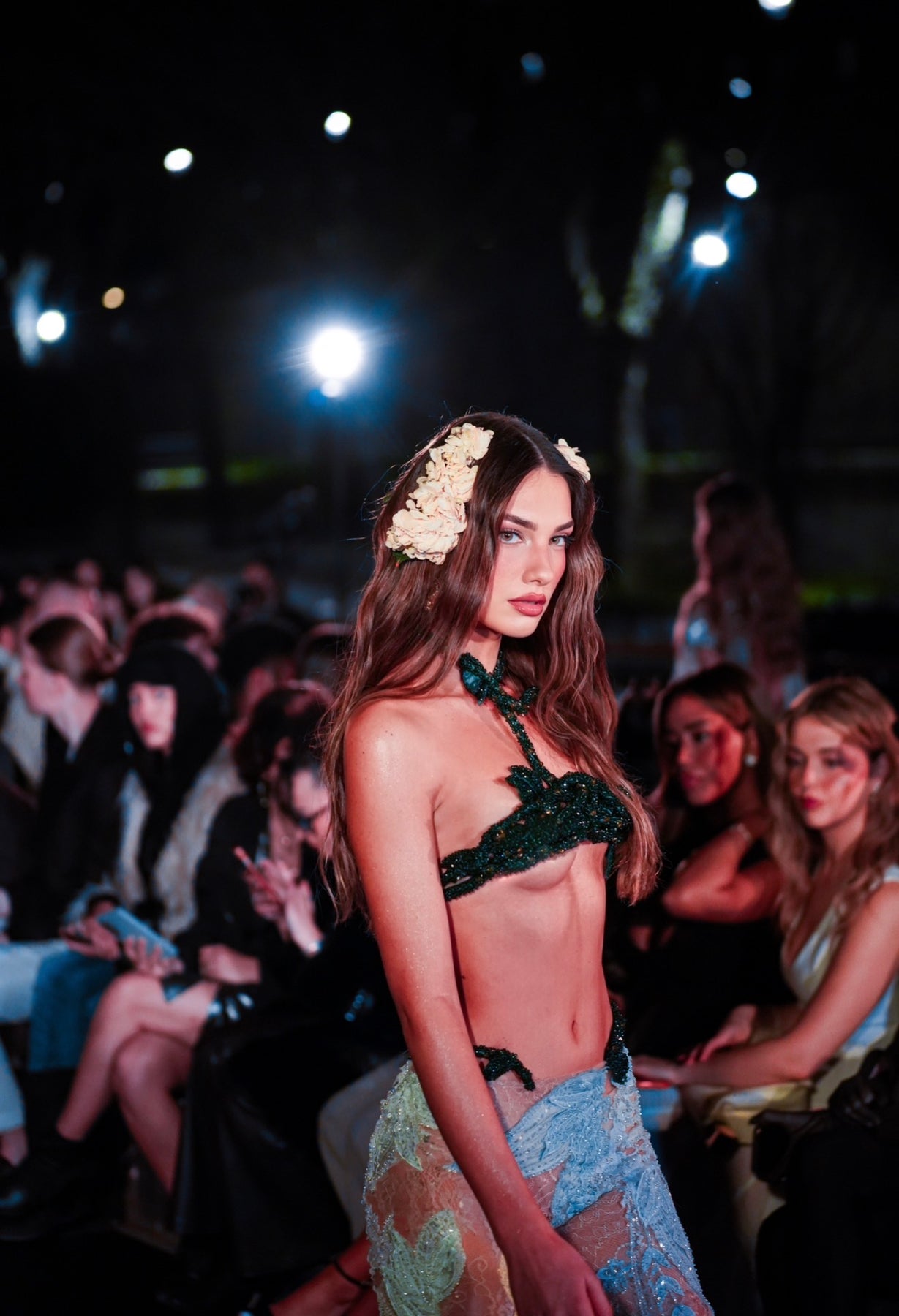 This sculptural top is fully handcrafted and constructed with intricate green beadwork forming floral vine stems and leaves. Each bead is carefully placed one by one, creating a delicate botanical structure that wraps around the body.