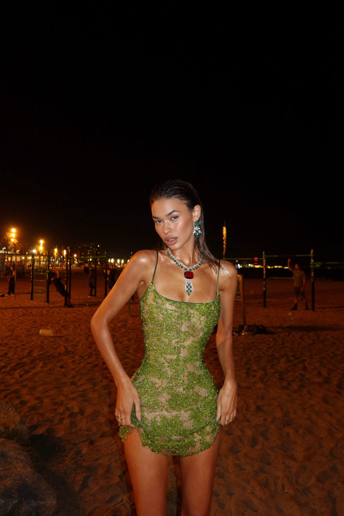 The uneven crystal arrangement gives the illusion of shimmering green leaves over bare skin, blending sensuality with artistry.
